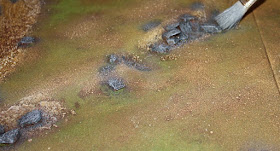 Anyway... I wanted to add some more color to the board to break up all of the green and brown so I painted the rocks and assorted rubble I added earlier (Waaaay back in Part Six) in gray tones. The exact colors don't matter as long as you have a dark, medium, and light gray (or can mix them).